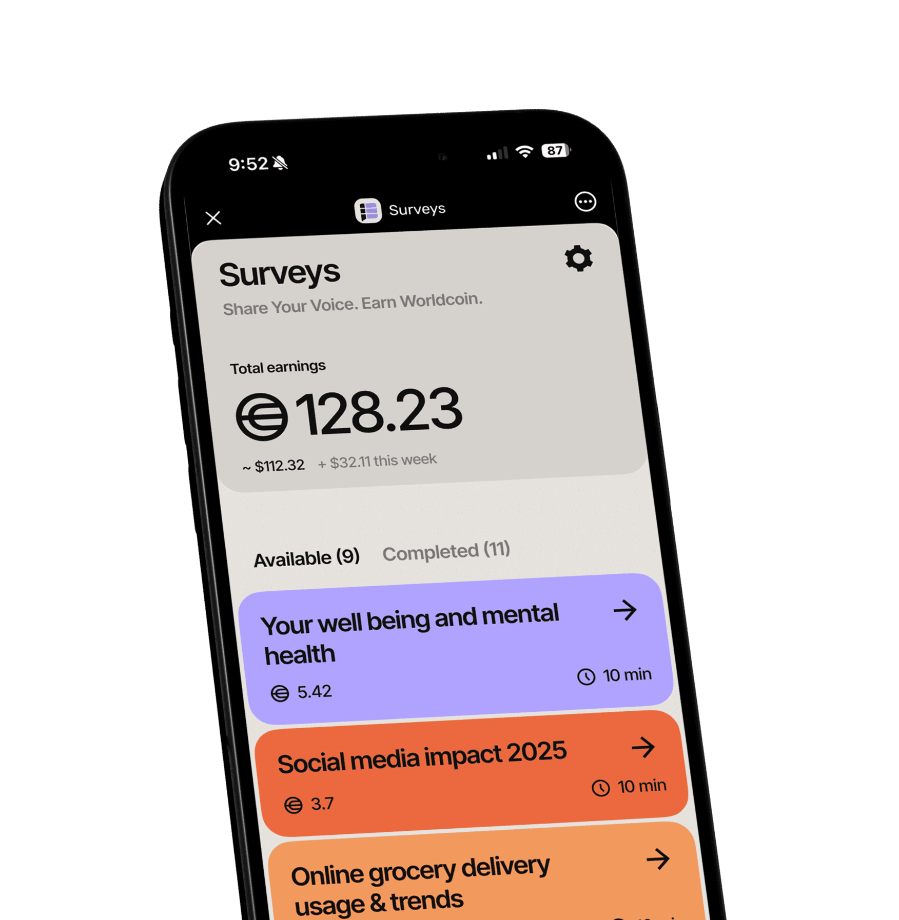 Users dive into quick, rewarding surveys on-the-go via the World App — earning Worldcoin for sharing views on finance, consumer trends, and global topics.