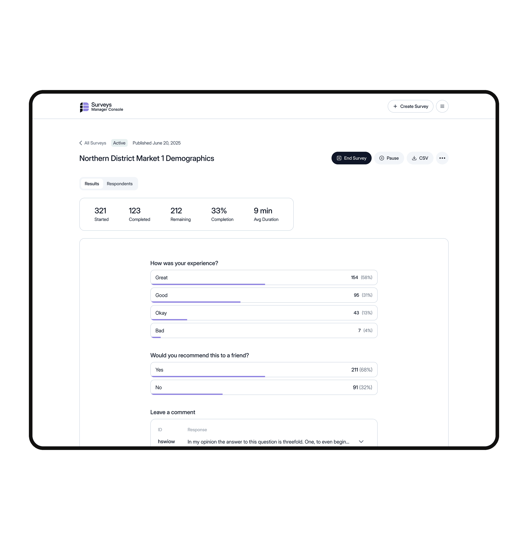 Craft surveys, launch with filters, monitor progress, and analyze results. Intuitive design previews and real-time tracking keep you agile.